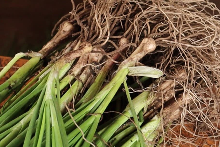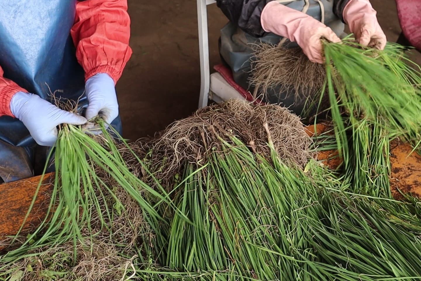 冬に地面に直接播種した「地床苗」を掘り起こし、選抜して束ねていきます。 球根がぷっくらと膨らんでいますよね。これが良い苗の証です!